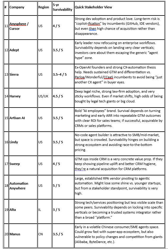 - Build a matrix where each of the 20 companies gets a stakeholder-specific survivability score (e.g., “Investor survivability: 4.5”, “Enterprise buyer survivability: 3.5”) and