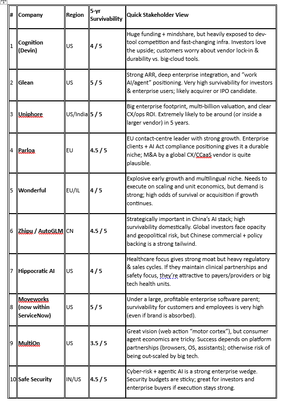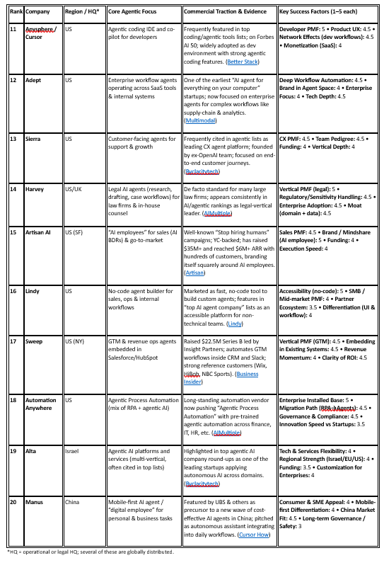 – These are likely to dominate specific verticals/regions (EU CX, EMEA multilingual CX, China consumer/SME, US healthcare). - Ranks 8–12 (Moveworks, MultiOn, Safe, Cursor, Adept)