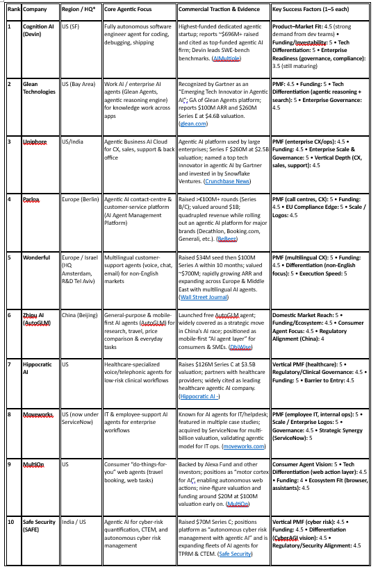 I’ve effectively ranked by combined commercial momentum + strategic position in the agentic AI stack, not just raw funding: