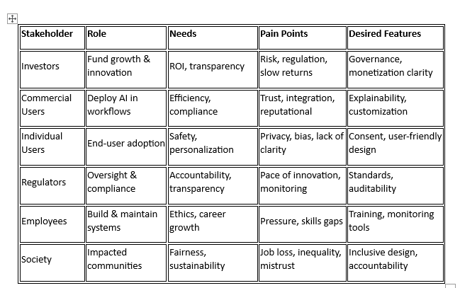 Stakeholders in agentic AI companies include investors, commercial users, individual consumers, regulators, employees, partners, and society at large. Each group has distinct roles, needs, pain points, and desired features that shape how agentic AI is developed, deployed, and governed