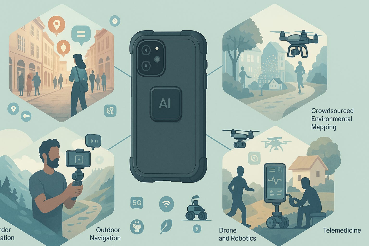 A modular rig turns the device into a pocket studio. AI suggests framing, stabilizes footage, edits highlights, and adds AR graphics. Drones or small ground robots act as roaming camera operators controlled by the same device. This raises production value for solo creators. - Outdoor Navigation and Safety