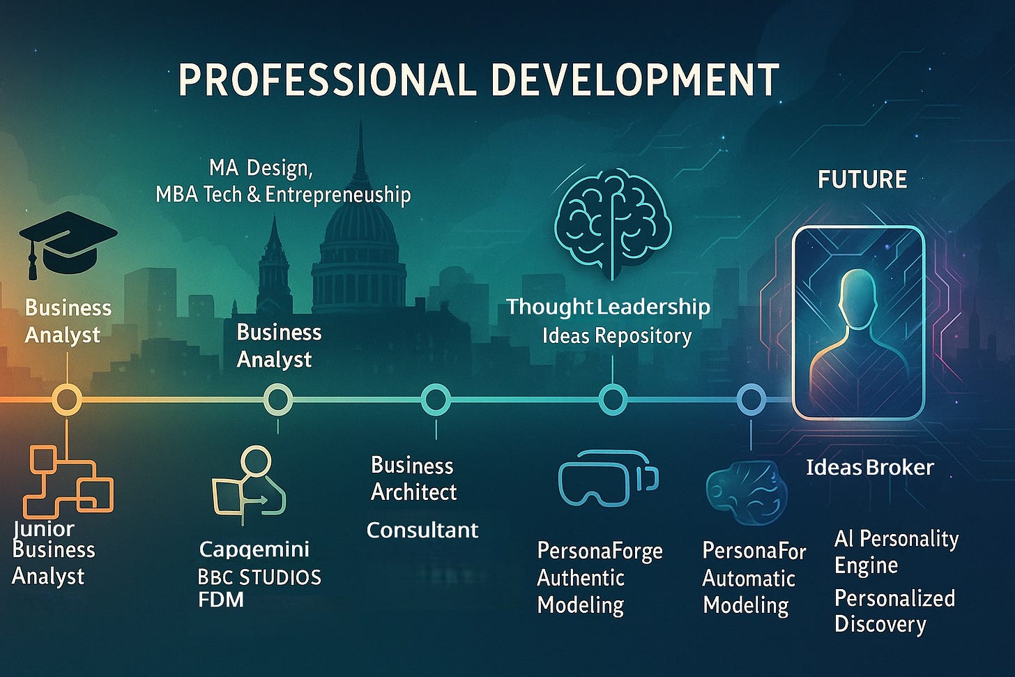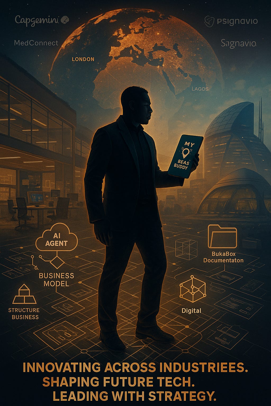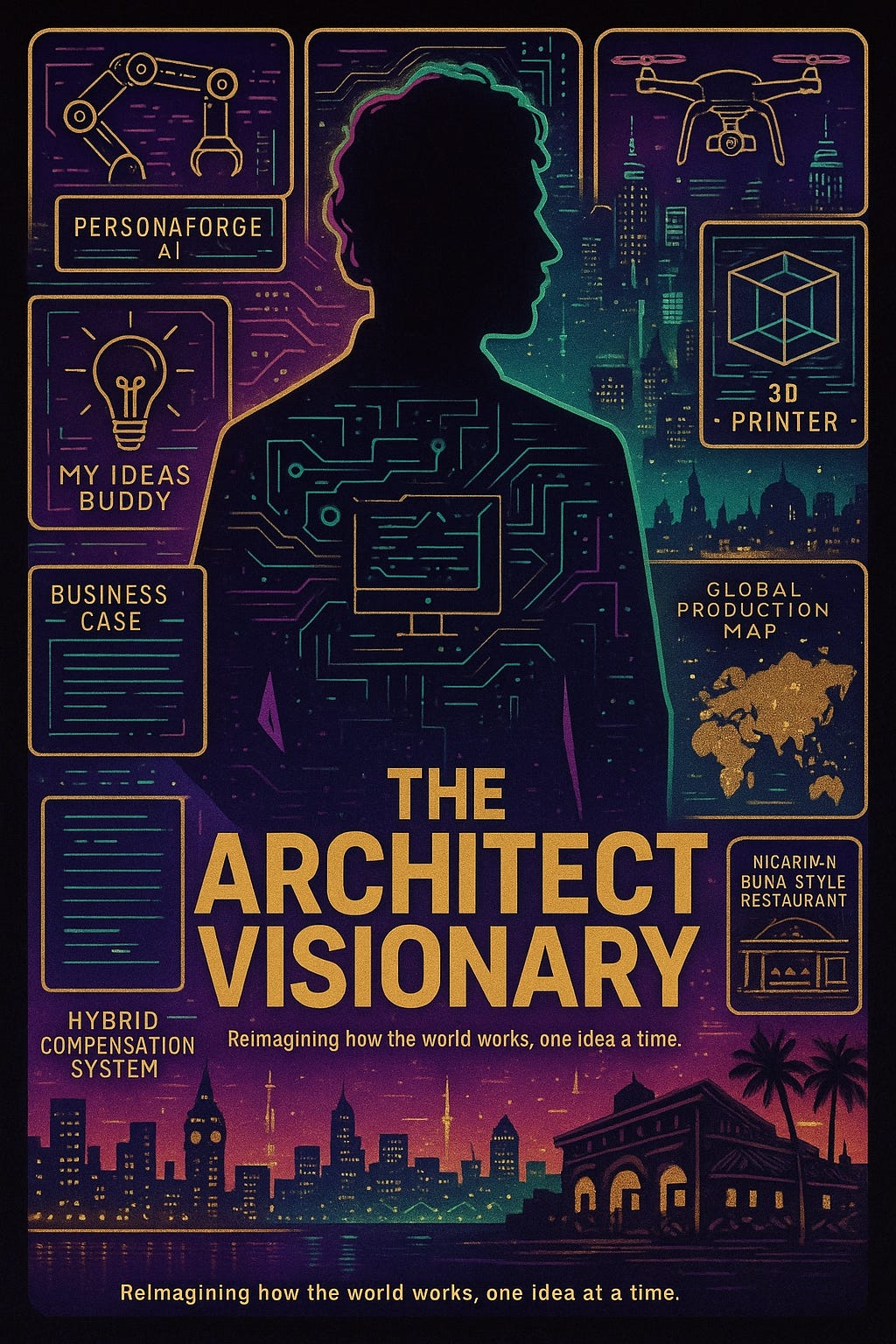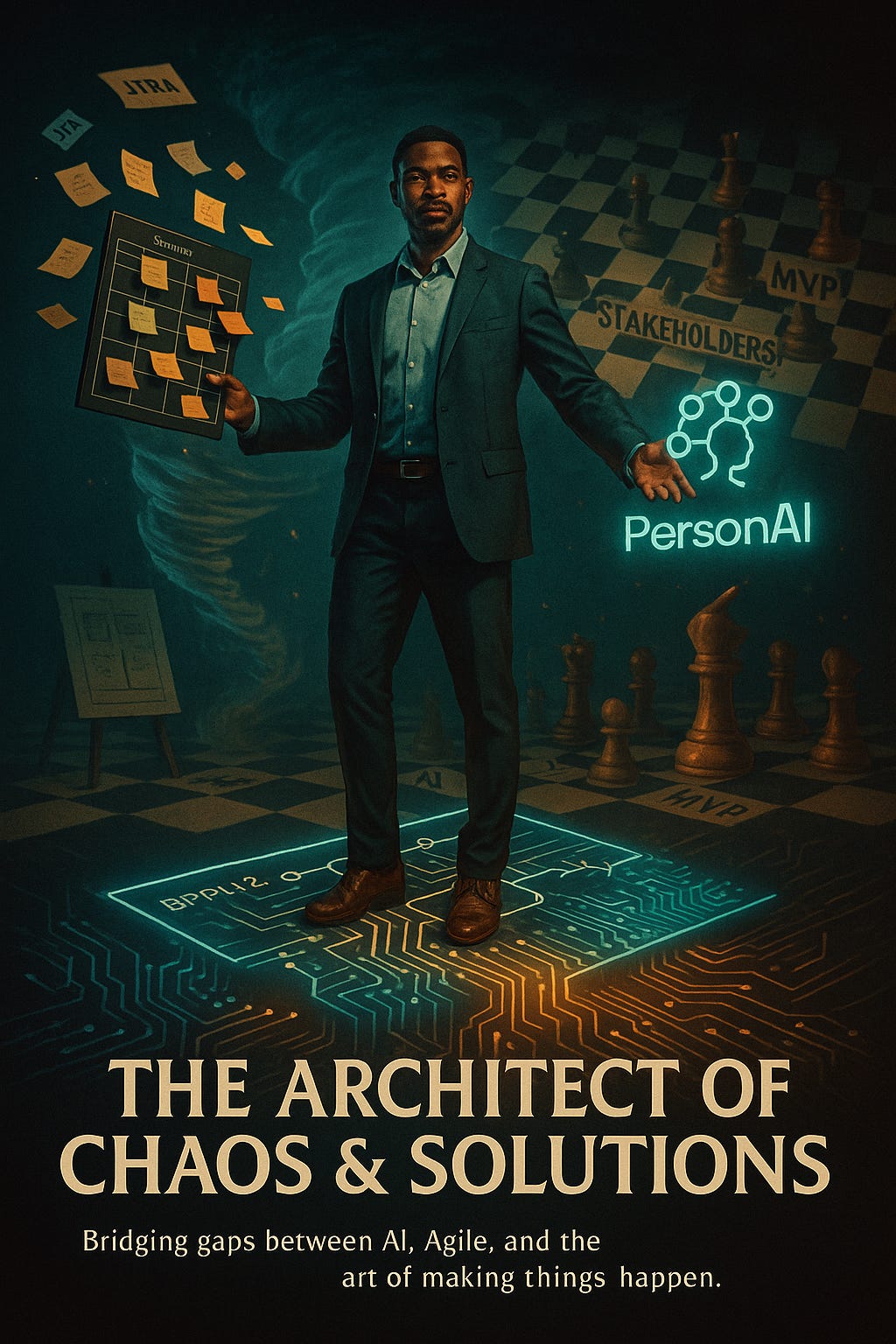 *”A cinematic hyper-stylized poster. A Black male protagonist (business casual, confident stance) stands atop a floating BPMN 2.0 flowchart that transforms into glowing circuit boards. One hand holds a Scrum board with flying sticky notes; the other gestures toward a futuristic AI social network (neon ‘PersonAI’ logo). Background: a chaotic chessboard (pieces labeled ‘AI,’ ‘Stakeholders,’ ‘MVP’), a tornado of Jira tickets, and a subtle easel with wireframes. Moody lighting, cyberpunk-meets-corporate aesthetic. Text overlay: ‘THE ARCHITECT OF CHAOS & SOLUTIONS’ in bold tech-serif font. Tagline at bottom: ‘Bridging gaps between AI, Agile, and the art of making things happen.'”*