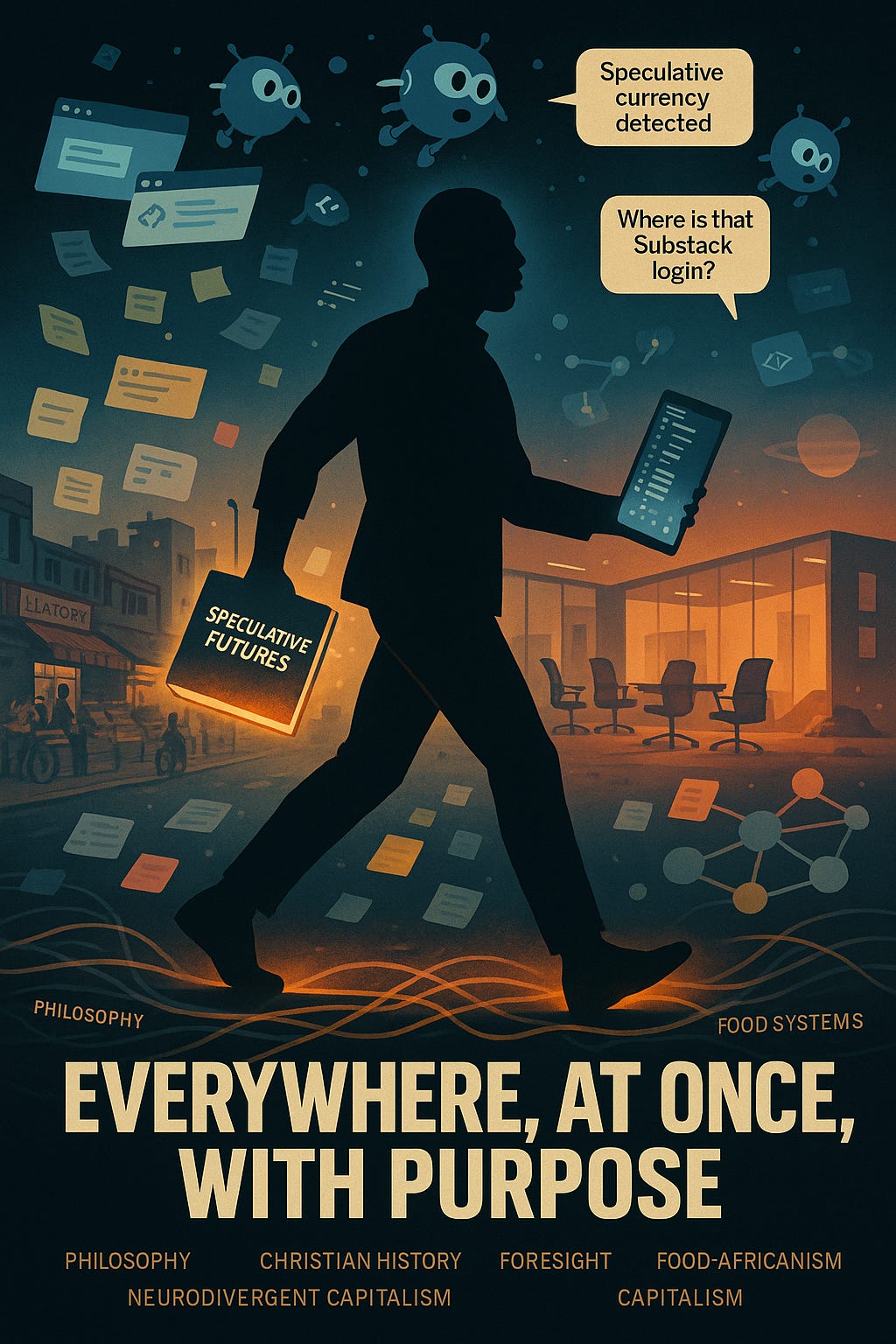 • An underground network of interconnected disciplines: Philosophy, Christian History, Foresight, Food Systems, Pan-Africanism, and Neurodivergent Capitalism