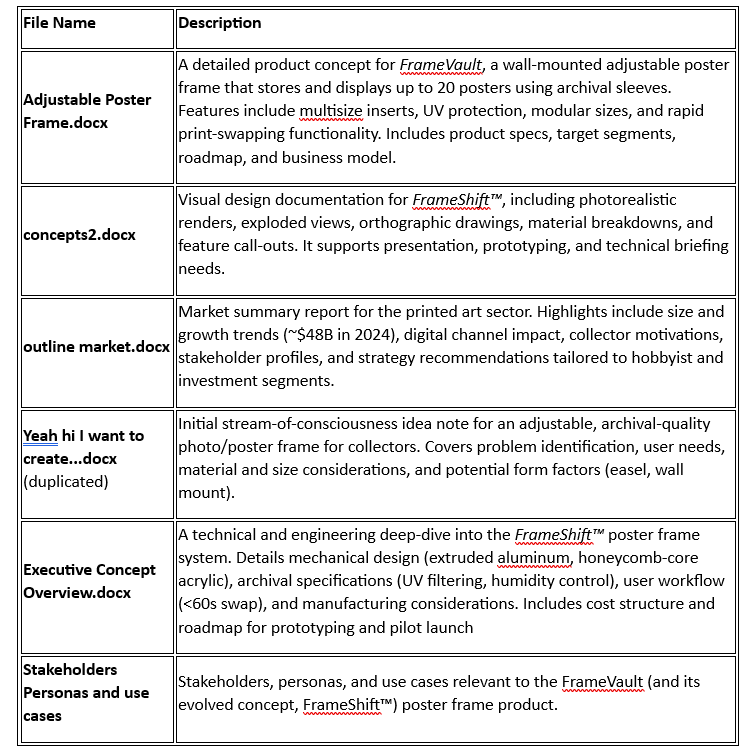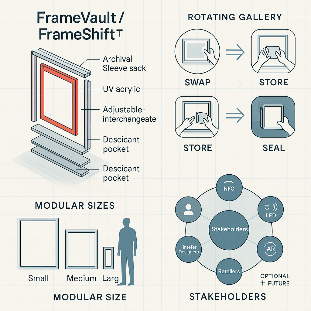 FrameVault / FrameShift™ is not just a product—it’s a design platform for collectors who want more than static frames and closet-stored prints. From the sliding magnetic clamps to the UV-shielded acrylic, every element is built to respect your art and your living space. The ability to rotate artwork in under 60 seconds, while preserving the rest of your collection in a sealed, archival-grade chamber, addresses a fundamental collector pain point.