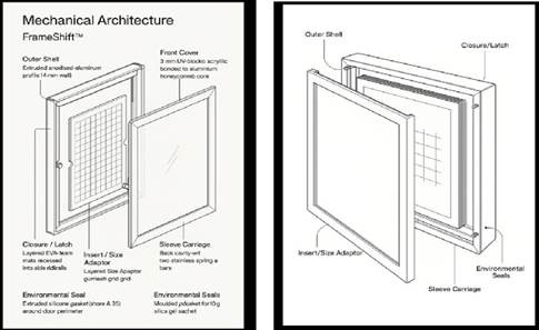 - The open FrameShift™ cavity shows where the sleeves park behind the display print—note the low-friction spring bar at the bottom.