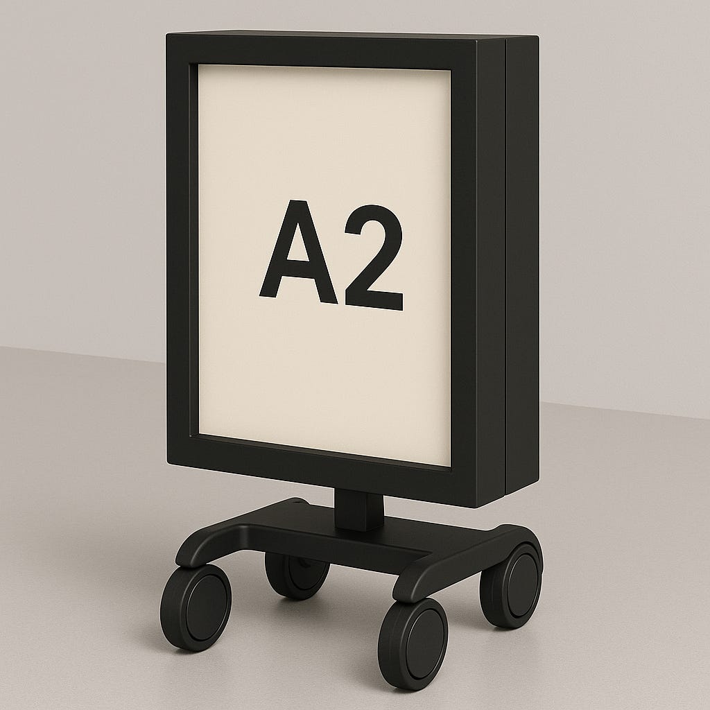 - Adjustability: Develop an insert system that centers various poster sizes (A4 to A1 / 24×36″) with precision. Explore magnetic clamps, sliding rails, or adaptive padding.