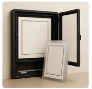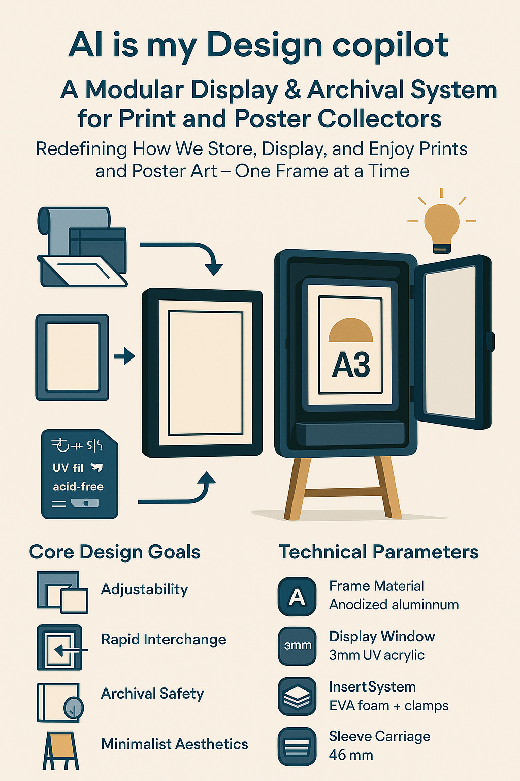 Design a sleek, wall-mountable poster frame that combines archival storage, adjustable display formats, and easy user interaction—all in a home-friendly form factor. The product must elegantly store 15–20 poster sleeves while offering rapid interchangeability of the front display, accommodating prints from A4 to A1 sizes.
