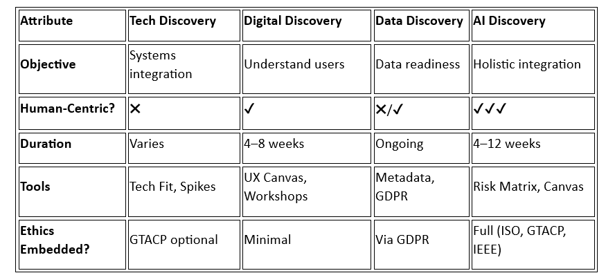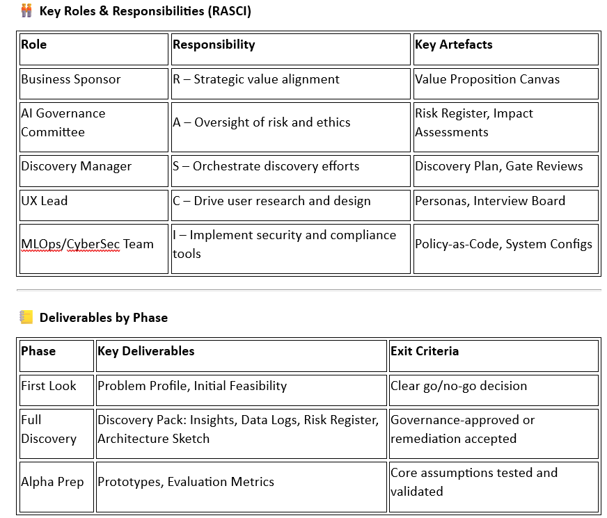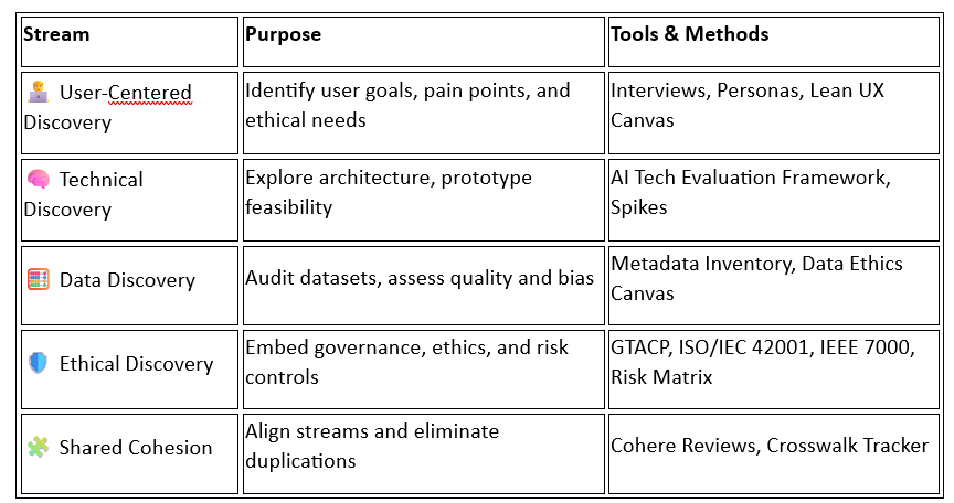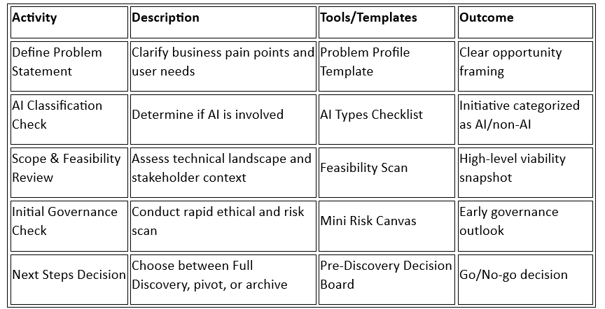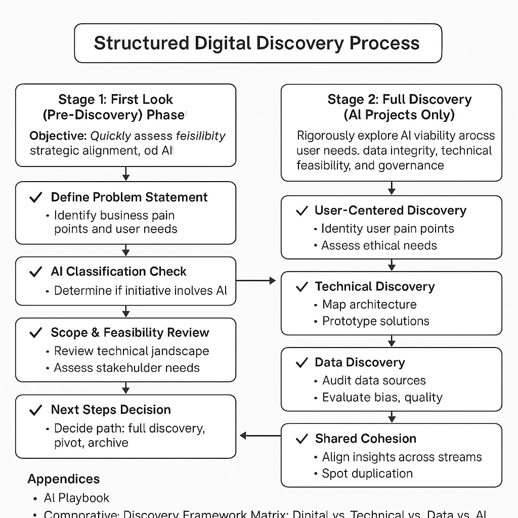 This guide outlines a two-stage AI-focused digital discovery process, supported by an AI Playbook It draws on best practices from the UK Government Agile Discovery model, GTACP AI governance, ISO/IEC 42001, and comparative frameworks spanning digital, technical, and data domains. This and supporting documents in the repository should be used as an input to creating your own AI discovery process and Playbook