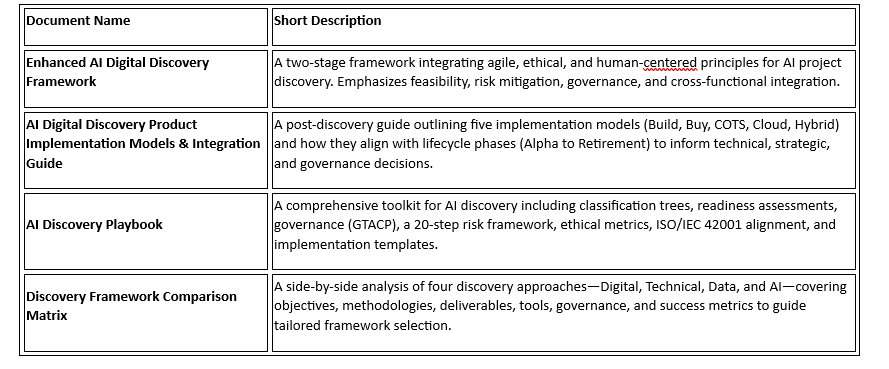 Detailed documents in Repository : AI Discovery , AI Discovery Governance Policy & Ethical Checklist , AI Classification Decision Checklist for Software Projects