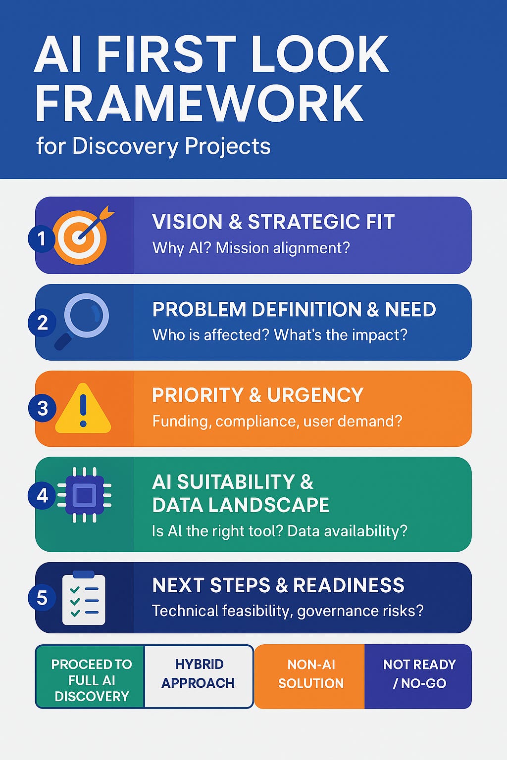This AI First Look Framework should be regularly reviewed and updated based on organizational learning, industry best practices, and evolving AI governance standards. The framework is designed to be flexible and adaptable to different organizational contexts while maintaining its core principles of rapid assessment, ethical screening, and user-centered design. This post is related to: Performing AI Discovery in the Age of Enterprise Transformation