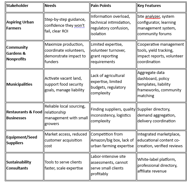 There’s a massive gap between “interested in urban farming” (millions) and “successfully operating urban farms” (thousands). This isn’t a market failure it’s a complexity problem that technology can solve. TerraNova targets the “missing middle”: individuals and small organizations (community gardens, schools, social enterprises) with budgets of $1,000-50,000 who are serious enough to invest time and money but can’t afford $10,000 consultants or navigate complexity alone.