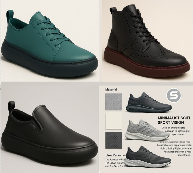 Based on Prompts these were some outcomes: Initial concept was then rendered as a casual shoe, boots, a variant and the extension of the design language into a sports shoe design. The outcomes or iterations and variations : Regular, variants, sport and special editions is found here Style . The documentation containing considerations and information for creating the shoe is found here Shoe Production
