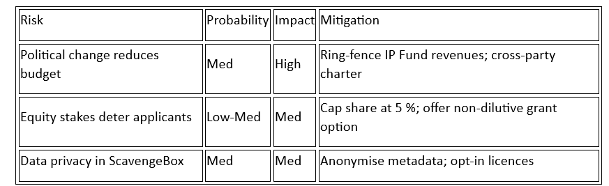 - Participation & IP Fund – new corporate vehicle taking 2‑5 % equity or capped royalties in downstream spin‑outs; target 60 % of outlay