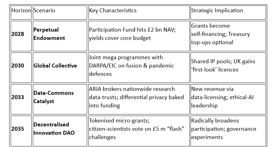Each scenario expands on the participatory, high‑leverage ethos while retaining ARIA’s core agility. Early pilots—such as blockchain‑verified micro‑grants or cross‑agency ‘grand challenge’ coalitions—can de‑risk these futures.