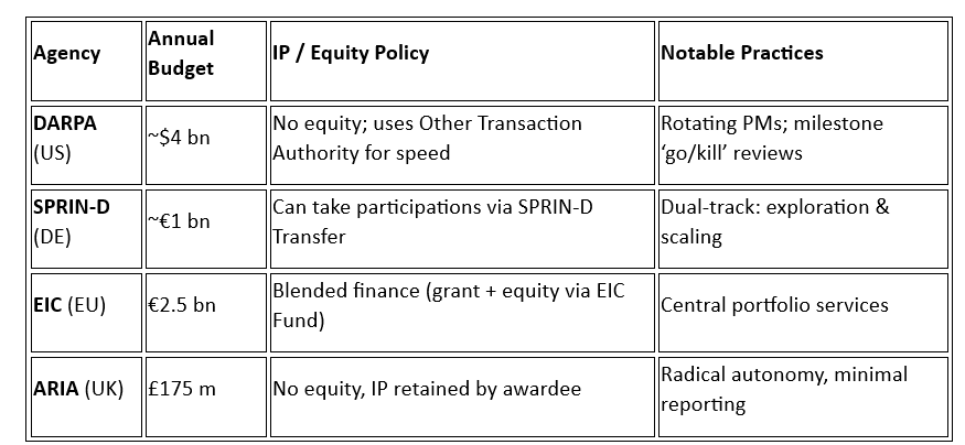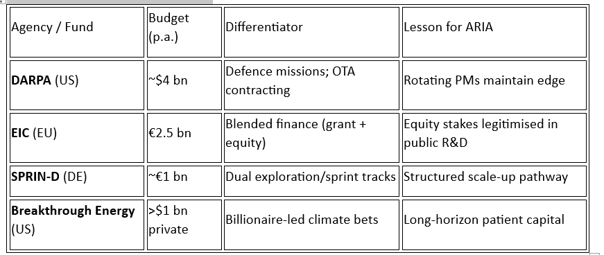 ARIA was established in 2023 with a £700 million budget to fund high‑risk, high‑reward R&D. While its mission is laudable and its governance model deliberately lean, the agency currently lacks two critical ingredients for long‑term impact: (a) funding scale commensurate with its ambitions, and (b) a mechanism to capture a fraction of the upside it helps create. This paper synthesises lessons from DARPA (US), SPRIN‑D (DE), and the European Innovation Council (EU) and proposes a two‑tier operating model that pairs ARIA’s grants with a national IP & equity participation fund. Additional recommendations include an AI‑driven “reverse funding” platform and a structured repository for discarded but valuable ideas. Are other agencies models a mental ceiling or should they be a refence model?