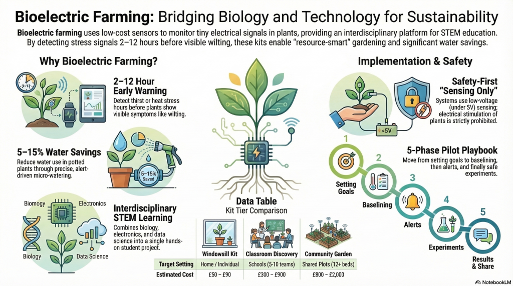 Bioelectric farming lets people see, hear, and analyse tiny electrical signals from plants. The attached market work shows a UK opportunity of £45 to £75 million per year across schools, community gardens, makerspaces, and hobbyists, with realistic year one targets of £2 to £4 million through focused go to market. Starter builds come in under £100, which fits tight education budgets and widens access for families. Classroom and community kits teach biology, electronics, and data, and they can also save water. Pilots routinely catch water stress 2 to 12 hours before visible wilt, and cut potted plant water use by 5 to 15 percent when people act on alerts. The attachments include safe hardware lists, lesson-friendly routines, and a simple process you can run in any setting.