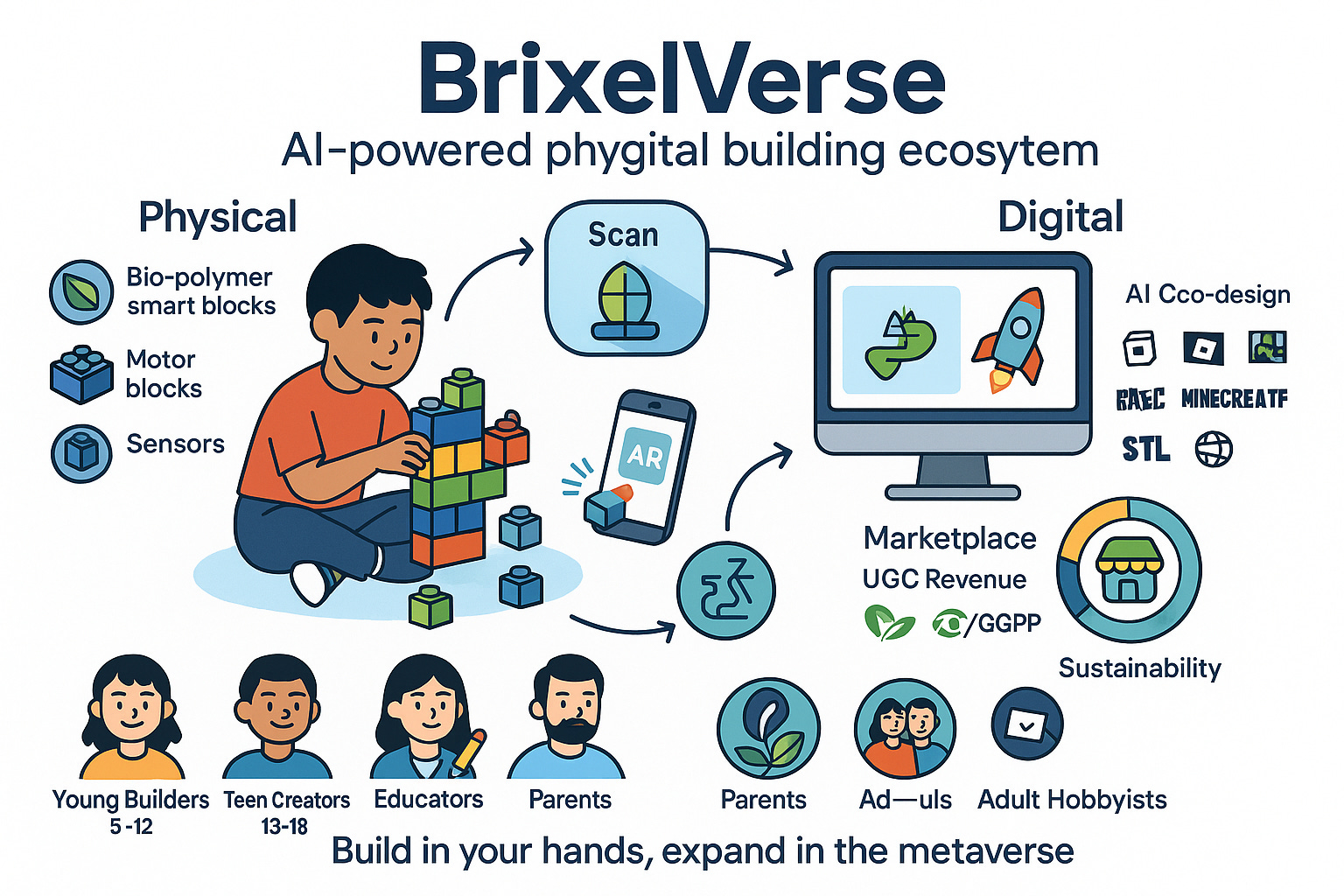 Imagine this: Your child builds a spaceship from sustainable smart blocks. They scan it with their tablet, and suddenly their creation comes alive in a digital universe. They can fly it through alien worlds, modify its design with AI assistance, and share it with friends across the globe. Other kids can download the blueprint, build their own version, and add their own creative twists.