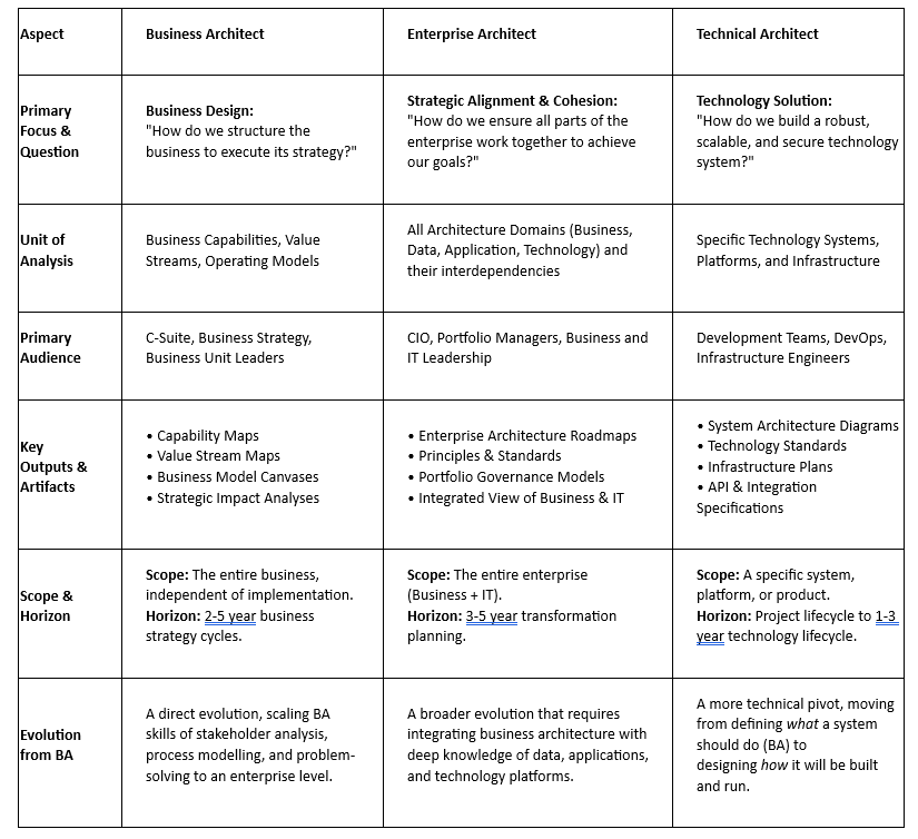 For a Business Analyst looking toward architecture, understanding the landscape is key. These roles are often confused but have distinct missions, scopes, and artifacts. Think of them as different lenses for viewing the organization. This table clarifies the focus, scope, and outputs that define each role:”