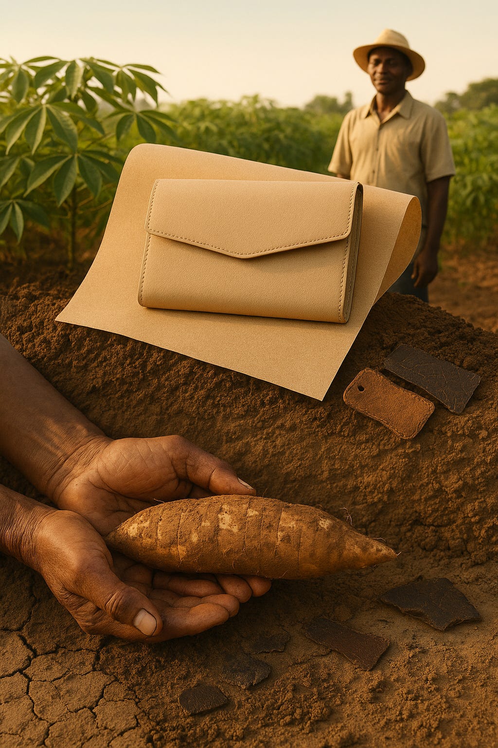 Brief, practical glimpse into a scalable materials idea. Cassava bioleather converts cassava starch into a flexible, compostable, leather like material that can power new product lines in fashion, interiors, and packaging. It solves the problems of high carbon animal leather and plastic based PU by giving you a clean, vegan option that can be locally produced in cassava growing regions. The idea uses an existing crop and turns it into a high value materials platform that works across many industries.