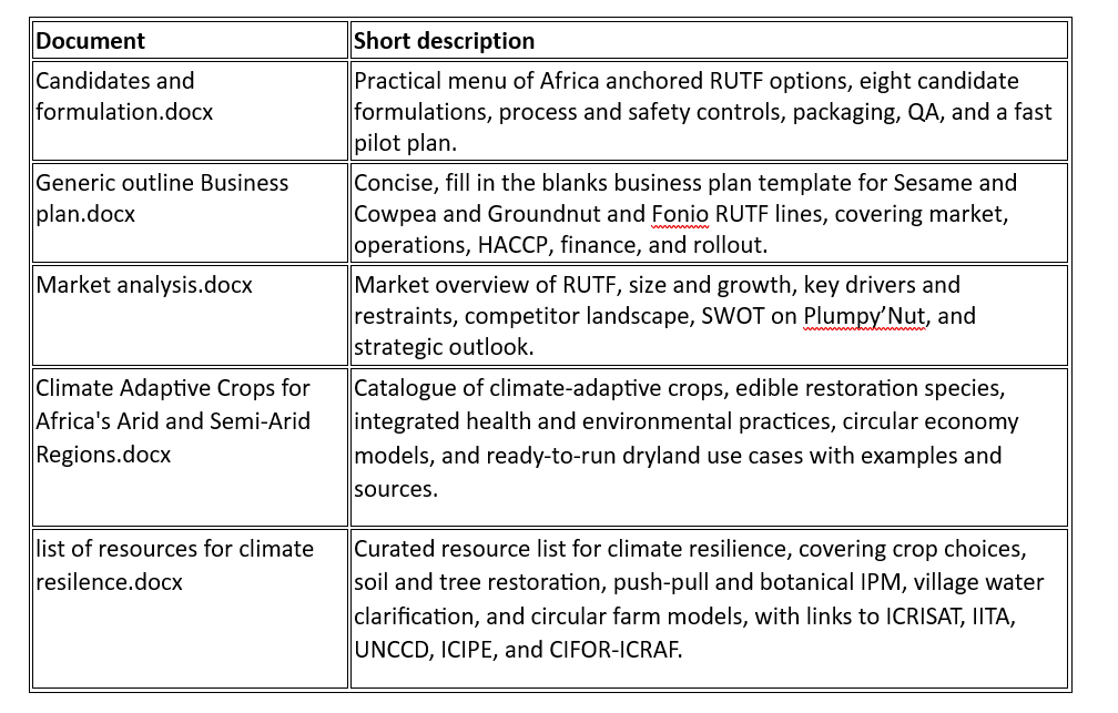 - Emergency Potential: Indigenous African crop with RUTF potential
