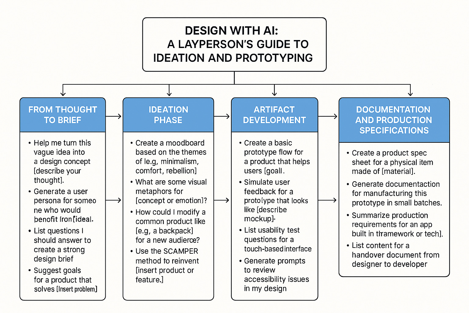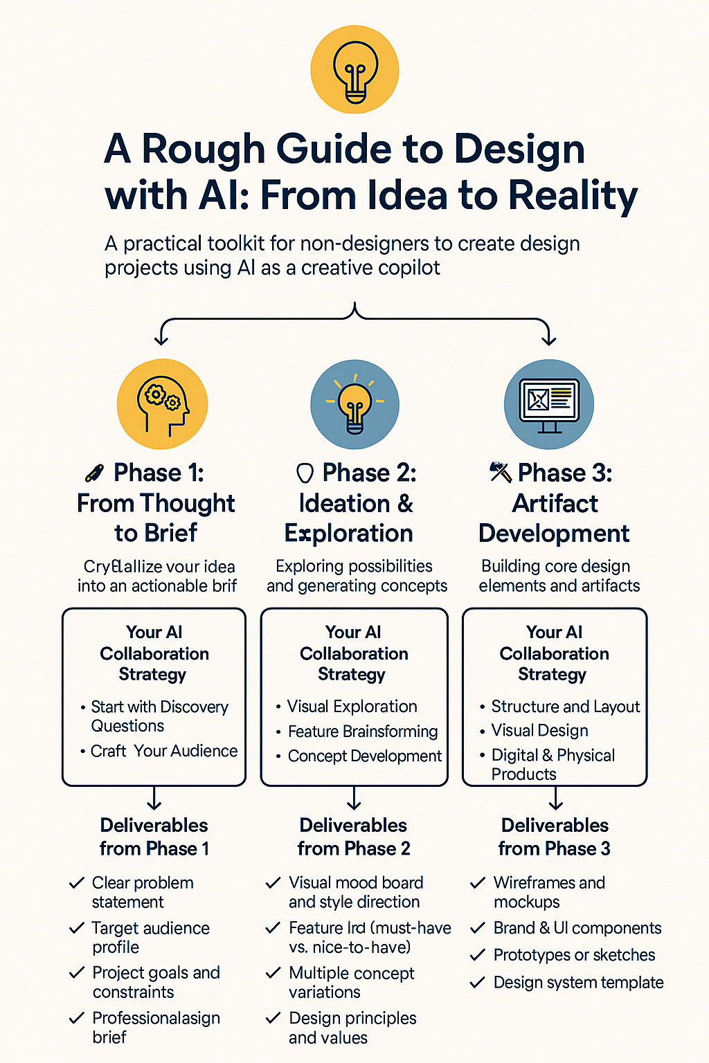 Your next step: Pick one idea you’ve been thinking about and start with Phase 1. Ask AI to help you turn that rough concept into a clear design brief. From there, let this guide walk you through each phase.