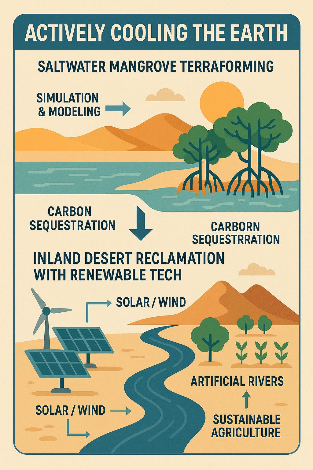 - Inland Desert Reclamation with Renewable Tech-Use large-scale solar/wind, hybrid desalination, artificial rivers, and sustainable agriculture techniques (e.g., superabsorbent polymers) to terraform arid inland regions.