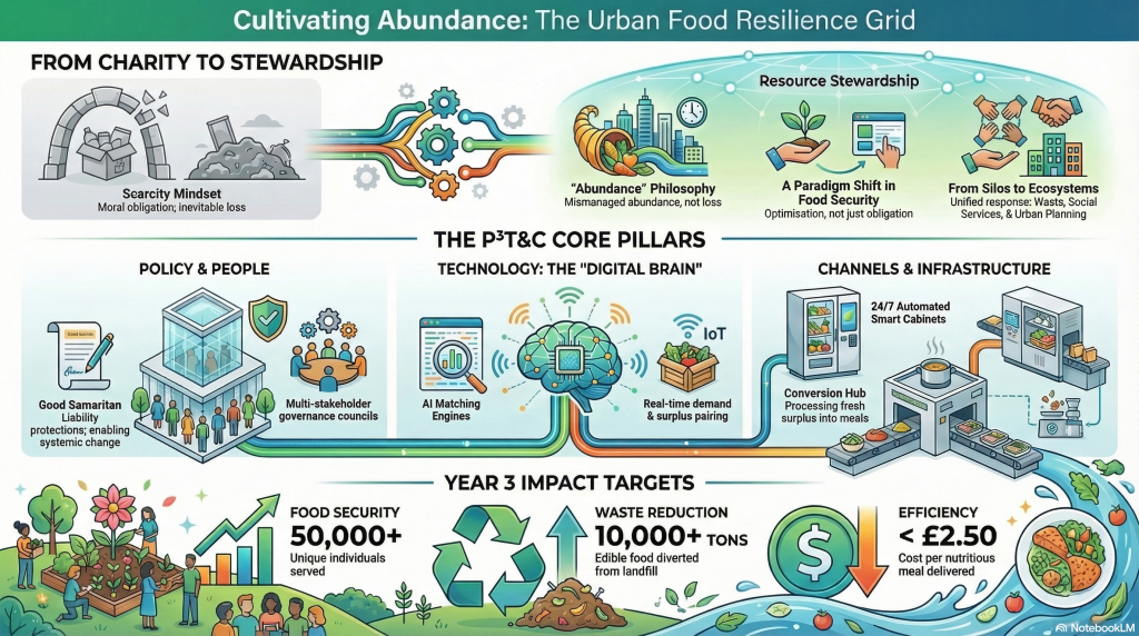 | A Systemic Blueprint for Urban Food Resilience | The core conceptual framework defining the Cultivating Abundance model. It explains the P³T&C structure, implementation logic, success metrics, and phased roadmap for building a city-scale food resilience operating system. It acts as the strategic foundation for all other documents. |