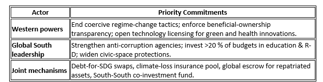 • Create a Global Anti-Corruption Escrow; flagged assets are held until transparent restitution plans emerge.
