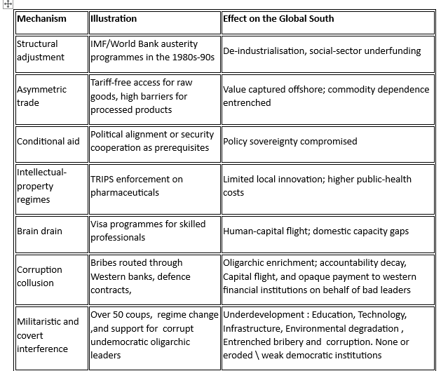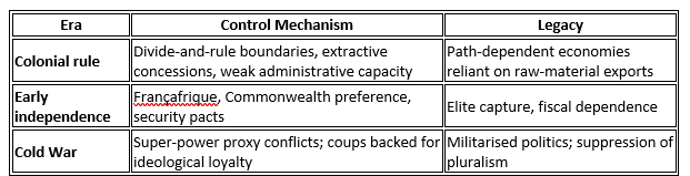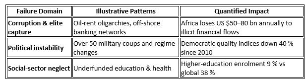 External interference and local governance failures intersect to sustain underdevelopment. Western post-colonial control mechanisms, together with elite complicity, perpetuate extractive economies, weak institutions and social fragmentation.
