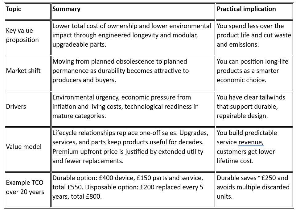 Durable, modular products deliver a lower total cost of ownership and a smaller environmental footprint by design. Are markets shifting from planned obsolescence to planned permanence as durability becomes attractive to producers and buyers. The change is driven by three forces: environmental urgency as climate risks and resource scarcity rise, economic pressure as inflation and living costs make TCO matter, and technological readiness as mature technologies enable reliable, repairable systems at viable cost. As these forces align, companies replace one-off transactions with lifecycle value relationships, using upgrades, services, and parts to keep products useful for decades. A higher upfront price becomes rational because the product avoids frequent replacements, reduces material waste, and spreads performance and maintenance costs over a longer life. It’s debateable if this model creates measurable value for customers and stable, revenue for firms, while cutting environmental impact. See The Market for Planned Permanence