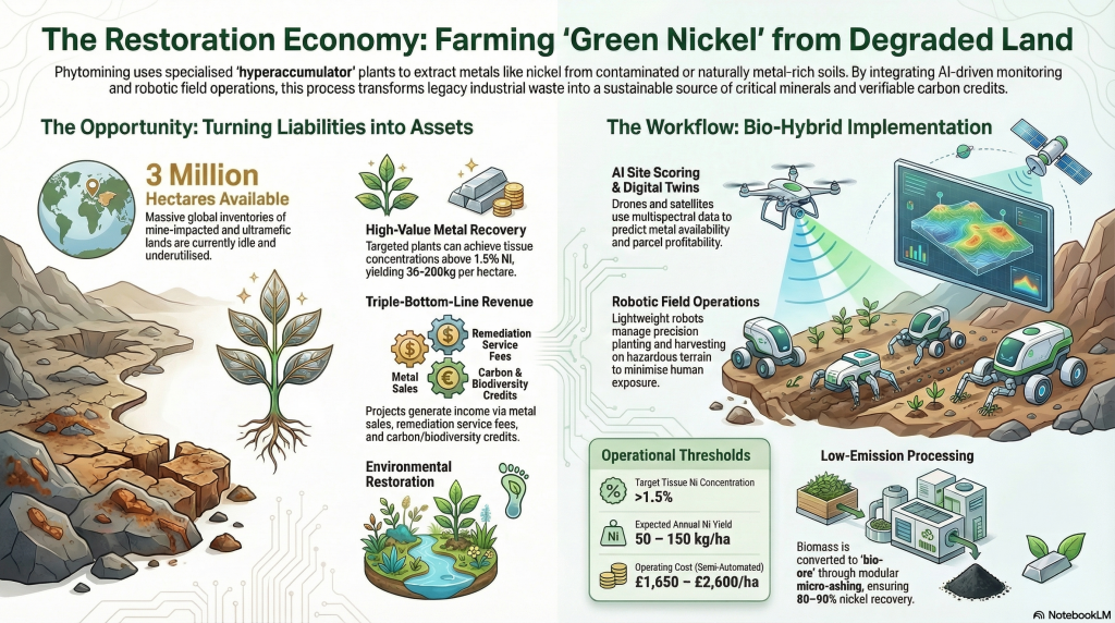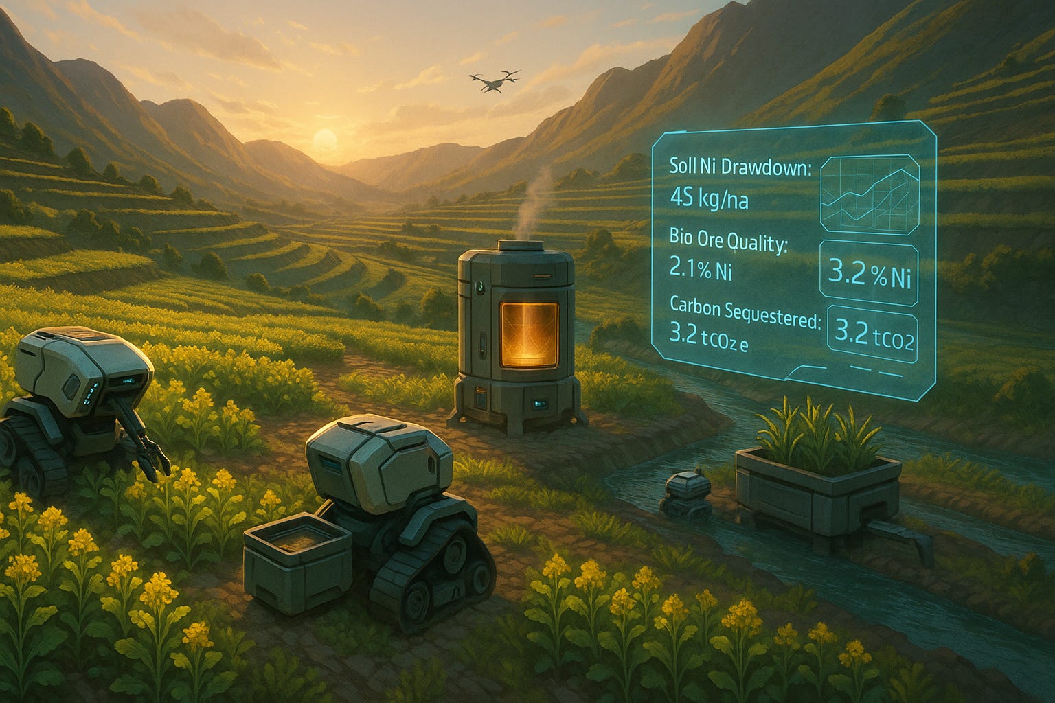 Degraded, metal rich land is a cost and a liability. What if the next profitable mine is a field of hyperaccumulator plants that pull nickel and other metals from soil while restoring ecosystems? You sell recovered metals, remediation services, and verifiable impact data. You run AI guided screening, semi-autonomous field ops, and tight MRV.
