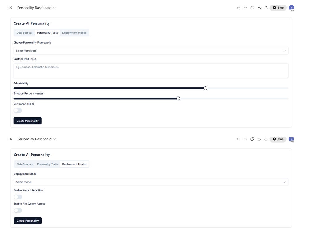 - Personality Trait Settings: Choose framework (MBTI, Big Five, etc.), customize traits, sliders for emotional responsiveness