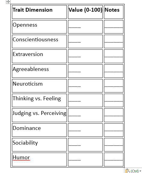 - Mimicry (0-100): __________ (ability to mirror user behavior)