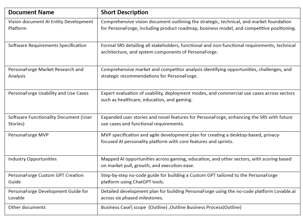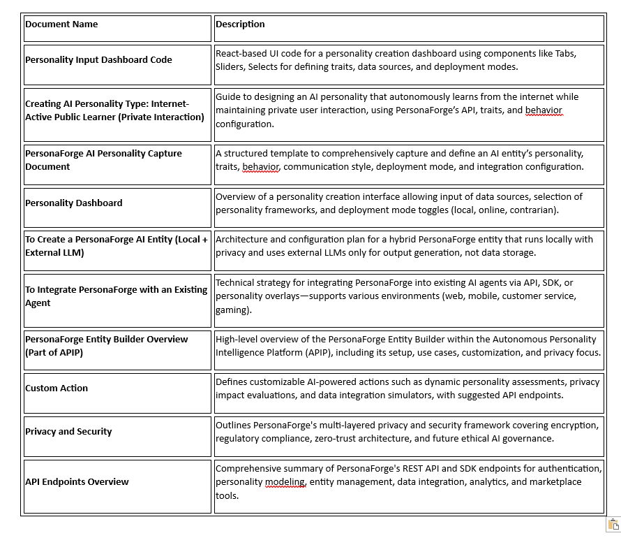 Here’s a table summarizing the uploaded PersonaForge-related documents, with their names and concise descriptions (first iteration):