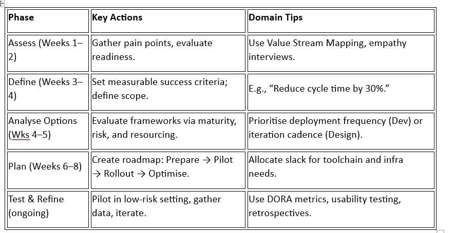 To support cross-cutting delivery, we tailored a Dual-Track Agile methodology to include specific guidance for AI use. Key adaptations included: