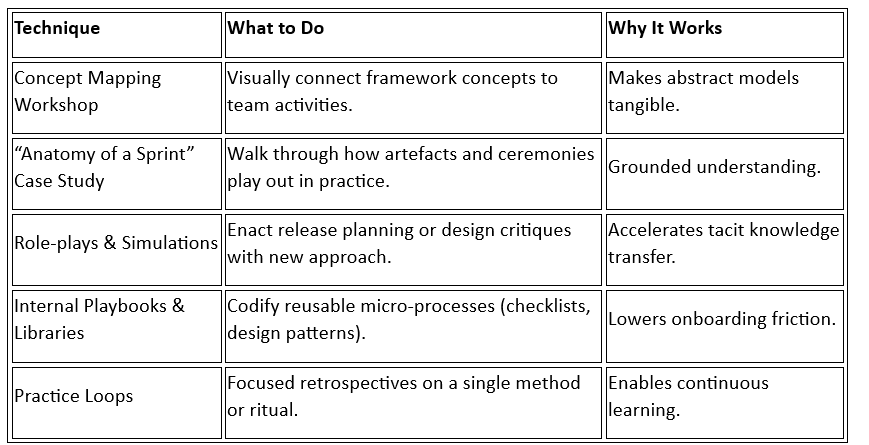 - Use sense-making rituals: Concept maps, case studies, and lived playbooks embed new patterns.