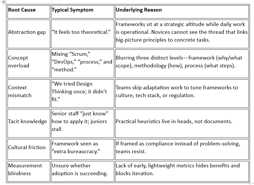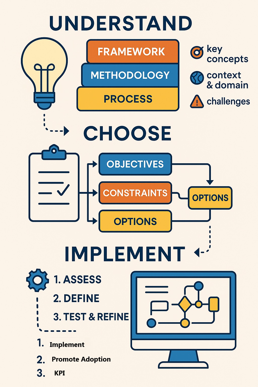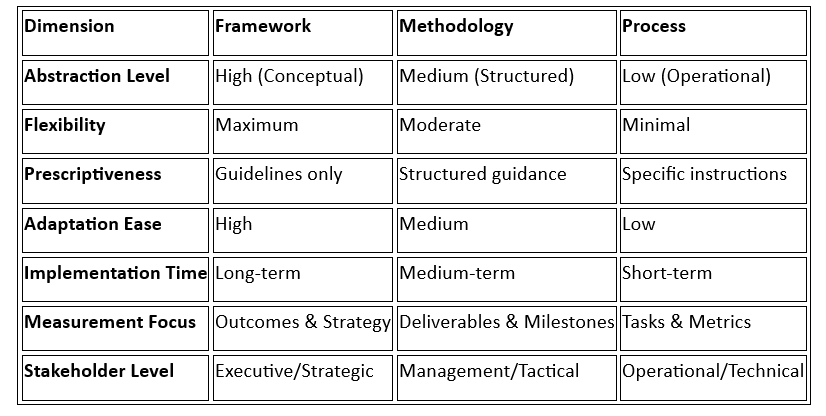In a landscape where people and organizations are under pressure to innovate, deliver value, and remain adaptable, the adoption of frameworks, methodologies, and processes has become central to strategy and execution. Yet despite their ubiquity, many individuals and teams struggle to grasp these constructs, differentiate their roles, or implement them effectively. The confusion is not trivial—it impacts project outcomes, stakeholder alignment, and organizational maturity. It causes adoption fatigue for users, an example is the adoption of software engineering frameworks from Waterfall to Agile. Success rate is measured by delivery on time and within budget has been abysmal . Frameworks, Methodologies, and Processes; understanding, implementation, organisation learning curve and churn, has been identified as a significant factor, impacting delivery for large scale projects. (lets not forget historic death by documentation and now it is little or no documentation).