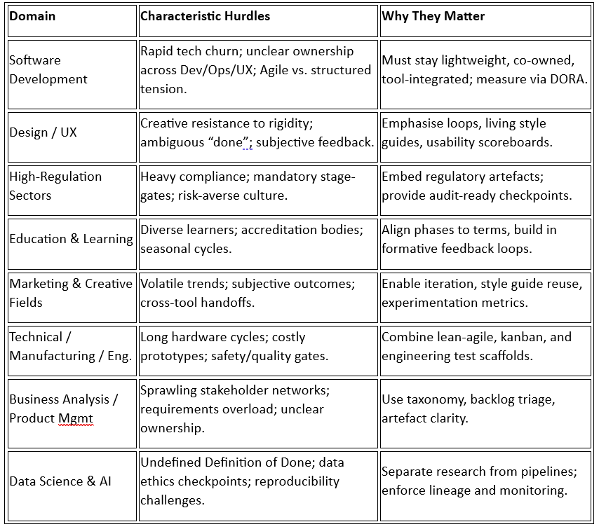 This article distils the essence (outline) of a comprehensive guide that maps out clear definitions, hierarchical relationships, domain-specific adaptations, and implementation pathways. It offers a lens through which professionals—from product managers to UX designers, engineers to educators—can better understand the tools at their disposal. More importantly, it provides a structured approach to contextualising and operationalising them within unique organizational environments. Whether you are introducing Agile to a design team or tailoring a compliance-driven framework in healthcare, the challenge is not just adoption—it is making meaning.