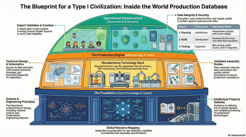 This is post explores one of many ideas on technical precursors for accelerating world development. Occasionally, I come across someone on YouTube who has built a car or device somewhere, and it is impressive for what it is—limited resources, back-to-basics innovation, or starting from first principles (usually in the third world)? It is fascinating to see such ingenuity in action. But this got me thinking: as a civilization, have we reached the point where we can compile a comprehensive production database of how to build anything—from basic to advanced—just like the resources available in the 3D printing community. Would this stifle ingenuity? I do not think so as its purpose is a curated product consisting of foundational knowledge, framework, methodology and database. It is a foundational cornerstone to the building of an advanced civilisation.