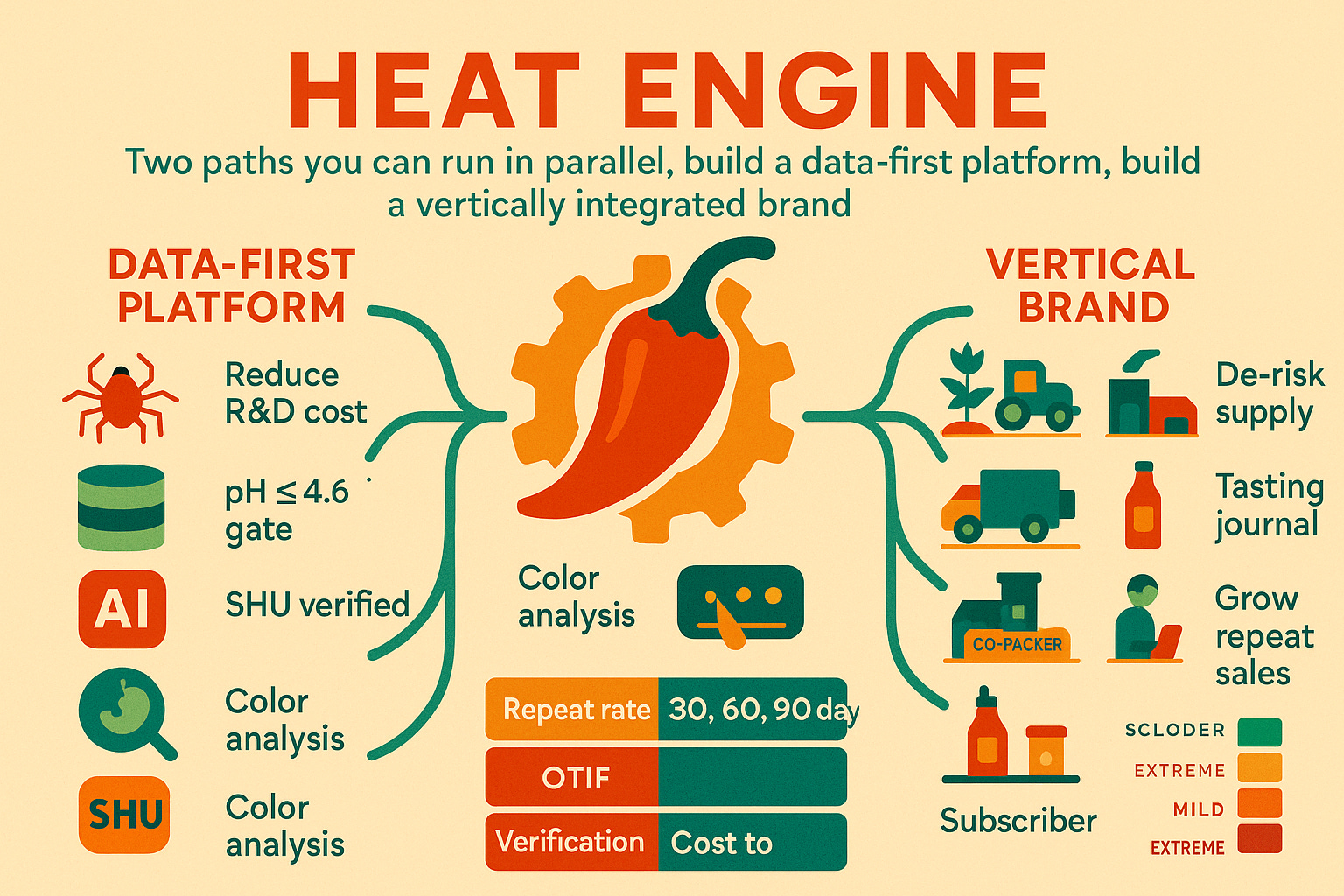 This piece gives you two clear paths. Path one, build the data layer first. Aggregate recipes, peppers, and lab signals into a searchable platform, then monetize through tools, APIs, and services. Path two, build the brand and the supply chain. Use predictive sourcing, AI recipe scaling, and co-packers to launch SKUs, then license your tech. You can also run both paths together.