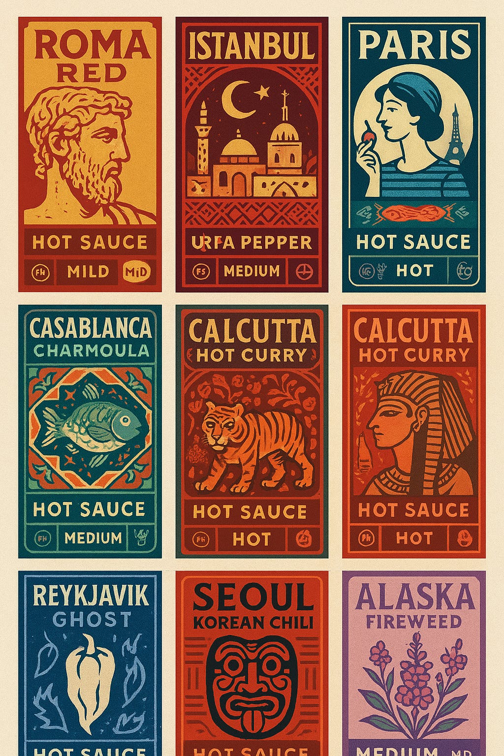 · Label generation prompt inspiration: visual design pack for 10 hot sauce labels