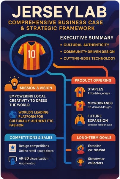 From Stream of Consciousness to Strategy Deck: How a Jersey Idea Became a Business Case. When you woke up last week and had the idea for Jerseys used in the process detailed in my Substack Capturing a Stream of Consciousness About an Idea using AI and the output was created (see appendices A) . You asked the new eager Analyst at your Business Design consultancy to develop and create a business case. She ideates and develops a research\ context document, for her own use to understand my verbal brief plus output i.e. wild ramblings (see appendices B, I chose to publish with permission her detailed analysis ) and finally voila !! she produces a Business case : what does that look like ? See end of conclusion for my critique.
