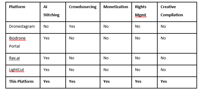 · Fragmented Solutions: Current drone platforms either specialize in sharing, editing, or mapping—but not all three. Contributors lose value due to absence of a centralized, rights-managed platform.