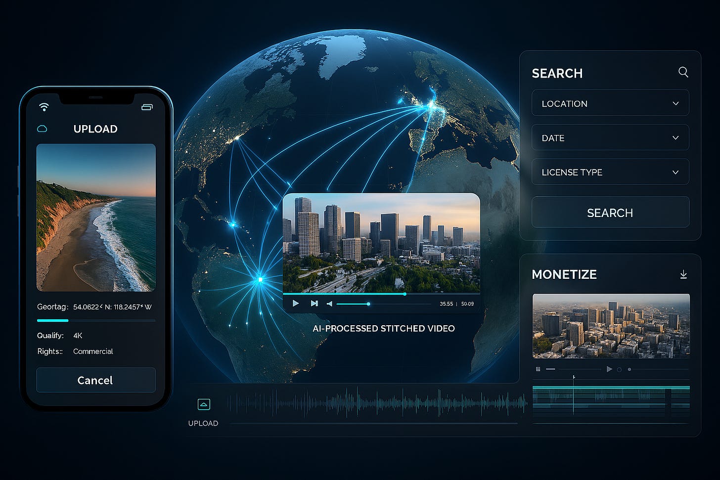 A crowdsourced aerial media platform that turns raw drone uploads into rights-clean, stitched, licensable footage. Contributors upload geo tagged videos with releases. AI handles ingest, quality checks, alignment, stabilization, color matching, and clip or reel creation. Buyers search by map and time, license instantly, and every contributor is paid by seconds used.