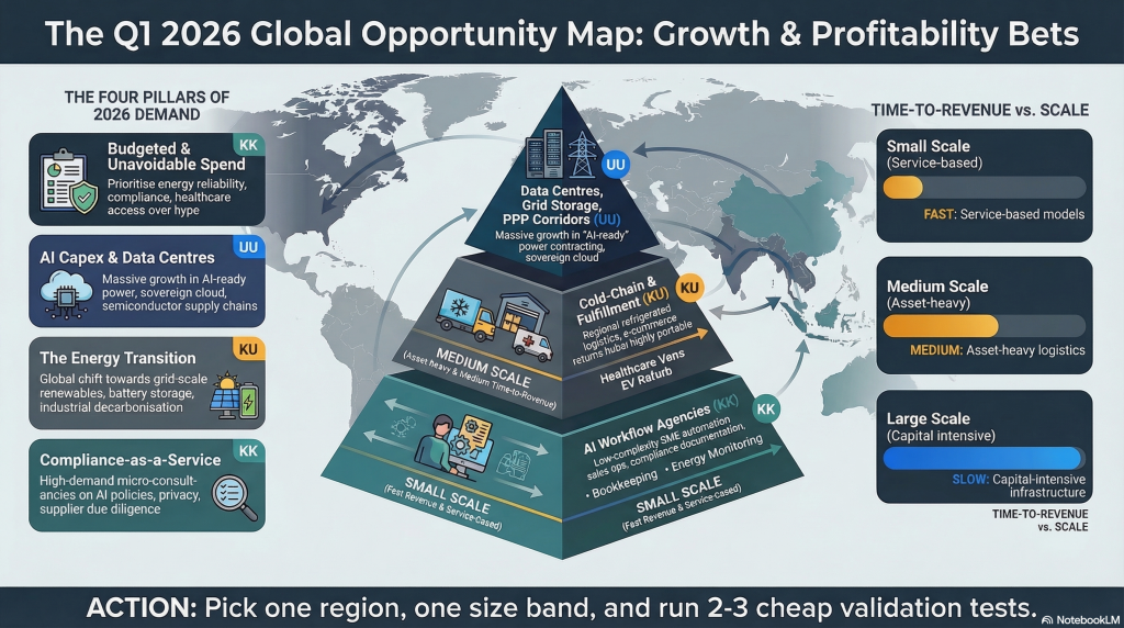 Q1 2026 will reward businesses that align with clear demand drivers already shaping spending decisions across governments, enterprises, and households. This edition of Business Idea Scout Chronicles curates growth and profitability-leaning business “bets” by global region, and splits them into Small, Medium, and Large opportunity bands.
