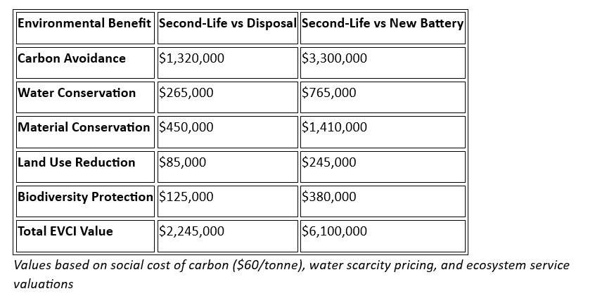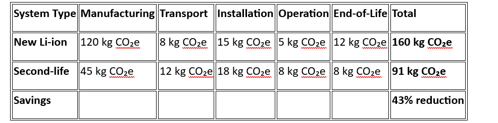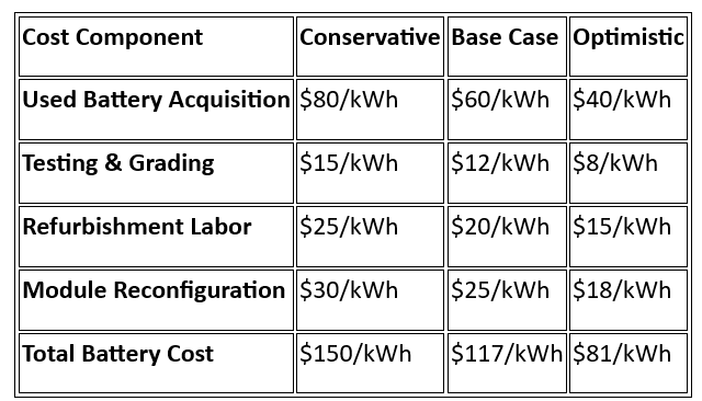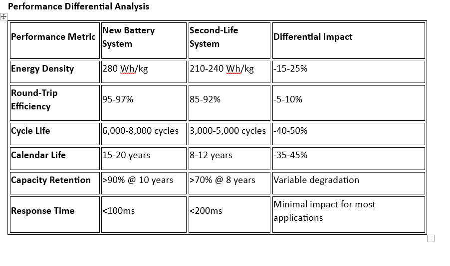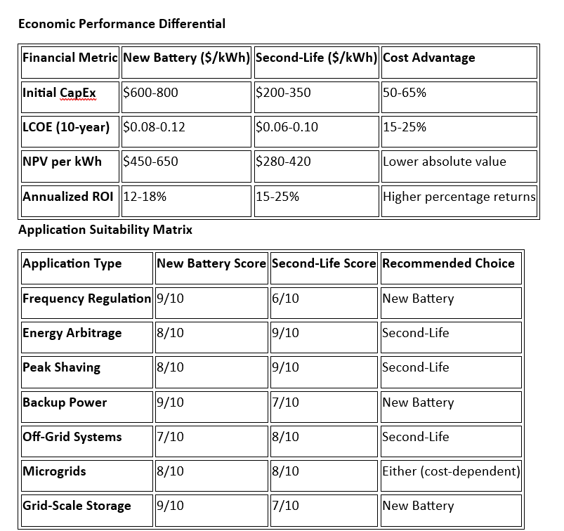 - Cost advantages of 40-60% compared to new battery systems ($150-250/kWh vs. $400-600/kWh)