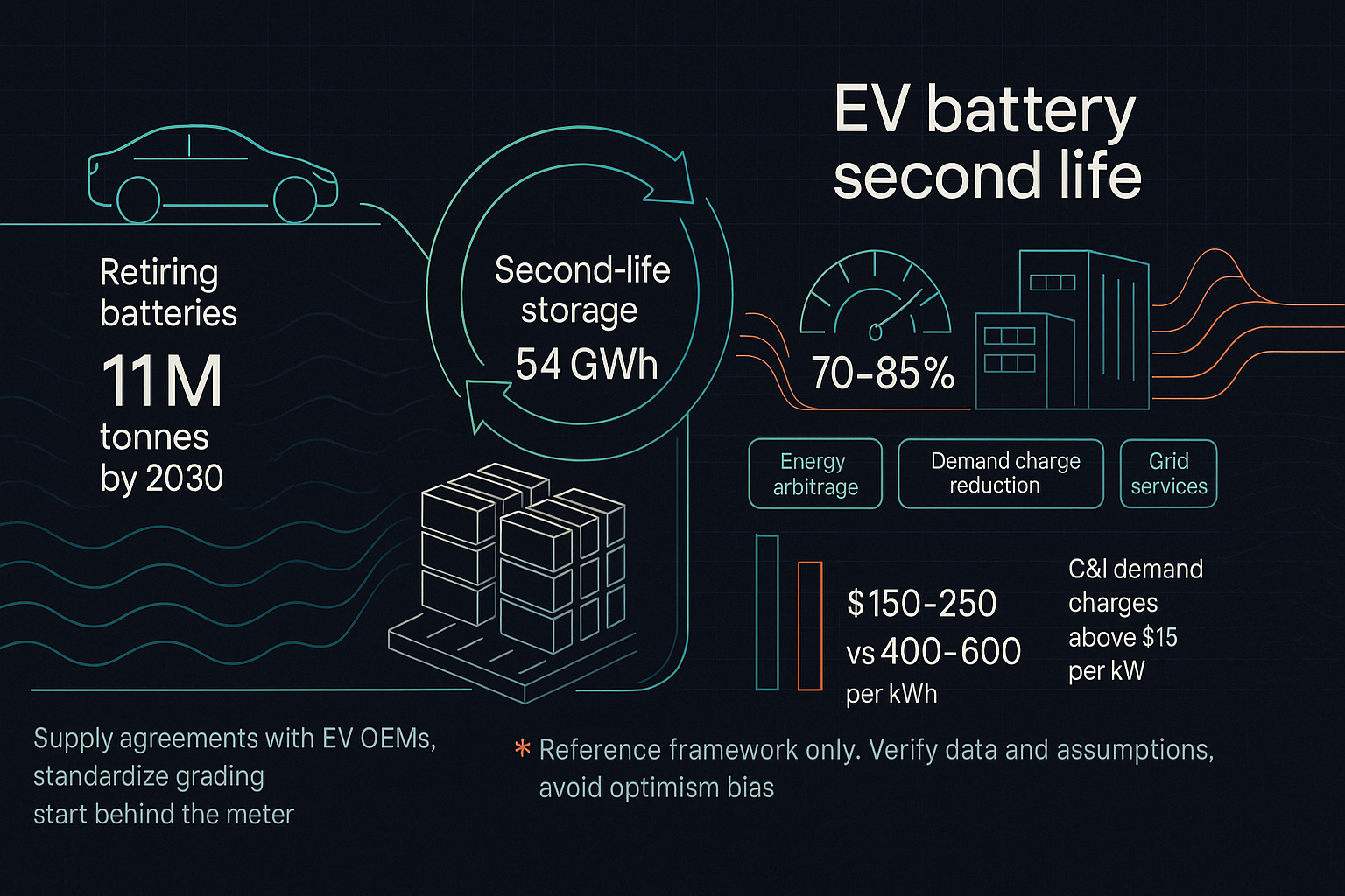 EV adoption is creating a surge of batteries that will reach end of life this decade. By 2030, more than 11 million tonnes of EV batteries will retire, opening a second-life storage market of about 54 GWh and roughly 16.2 billion dollars. Refurbished packs typically retain 70 to 85 percent capacity and can cut installed costs by 40 to 60 percent versus new systems, at about 150 to 250 dollars per kWh compared with 400 to 600 dollars. You can capture near-term value through energy arbitrage, demand charge reduction, and grid services, while prioritizing C&I sites with demand charges above 15 dollars per kW. Build supply agreements with major EV OEMs, standardize grading, and start behind the meter to limit regulatory friction. This report gives you a clear technical architecture, a refurbishment and BMS spec, and a 1 MWh financial model that shows IRR potential from about 12 to 27 percent, so you can move from pilot to scale with confidence.