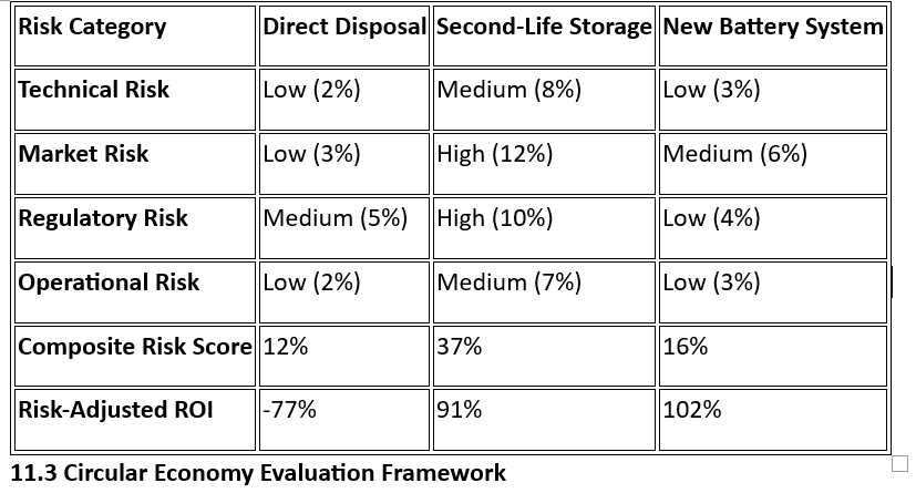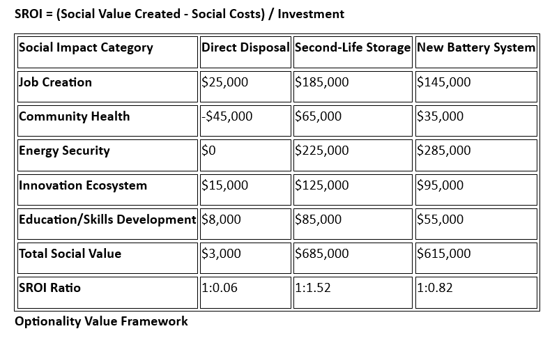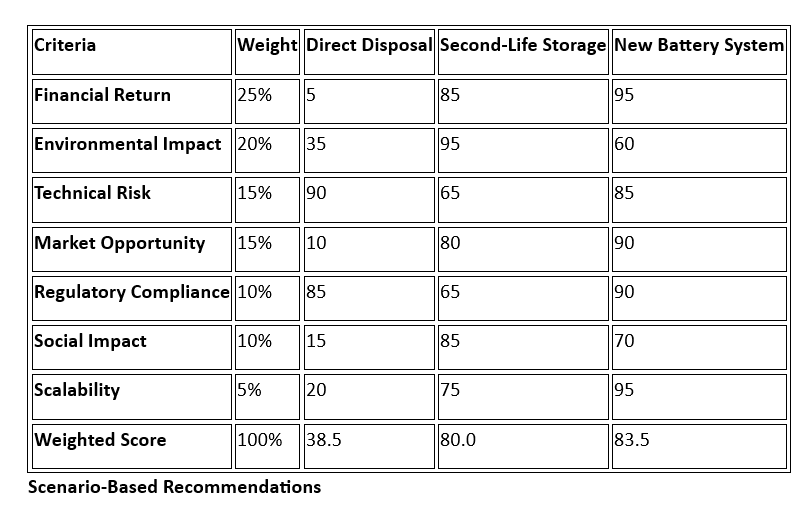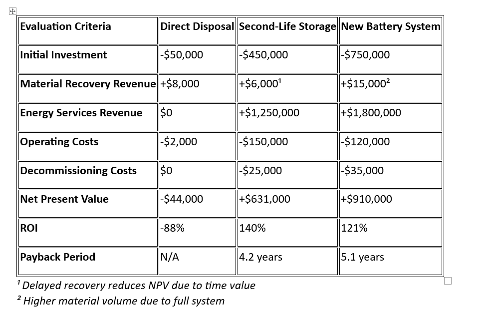 This section provides a comprehensive comparison of three pathways for end-of-life EV batteries using traditional financial metrics alongside new circular economy and sustainability evaluation frameworks.