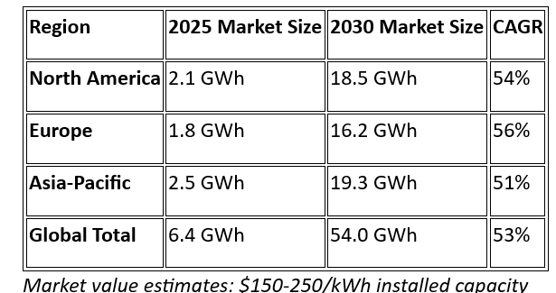 - Primary revenue streams include energy arbitrage ($50-150/MWh), demand charge reduction (20-40% savings), and grid services ($200-400/MW-year)