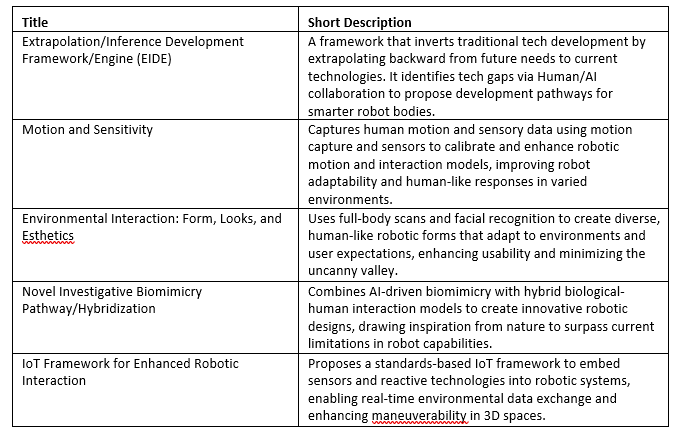 • Technology: Reinforcement‑learning‑at‑scale; graphene‑based tactile arrays; generative design for compliant morphologies; battery‑free sensor knots.